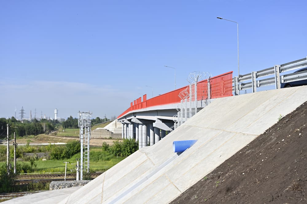 Протяженность объекта — 3,8 км. Проектом предусмотрено строительство 3 путепроводов, 4 подпорных стенок и 7 дорожных участков. Строительно-монтажные работы ведутся с января 2025 года. Уже возведена наземная часть путепроводов. Первый и третий путепровод готов на 90 %, второй — на 75 %. На основном ходе и съездах устроена дорожная одежда и нижний слой основания, установлен бортовой камень. На 40 % готово наружное освещение.